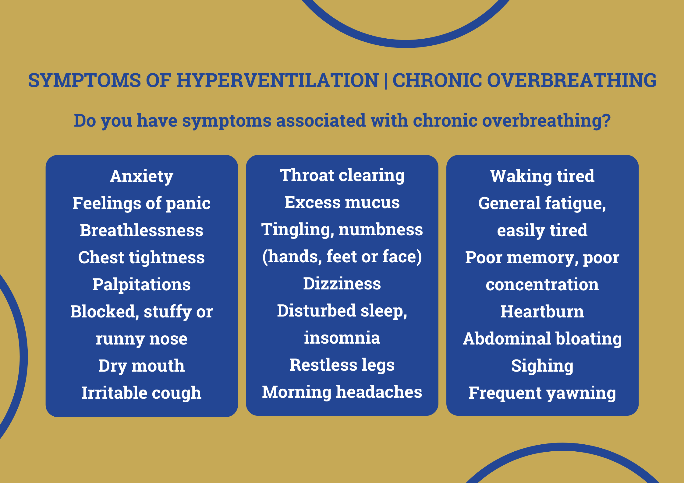 The most common overriding breathing dysfunction seen is chronic “overbreathing” - breathing too much air. Chronic overbreathing or hyperventilation is a well-documented contributory factor to the symptoms in this list. This is not an exhaustive list, and many of these symptoms may also be associated with other ailments.